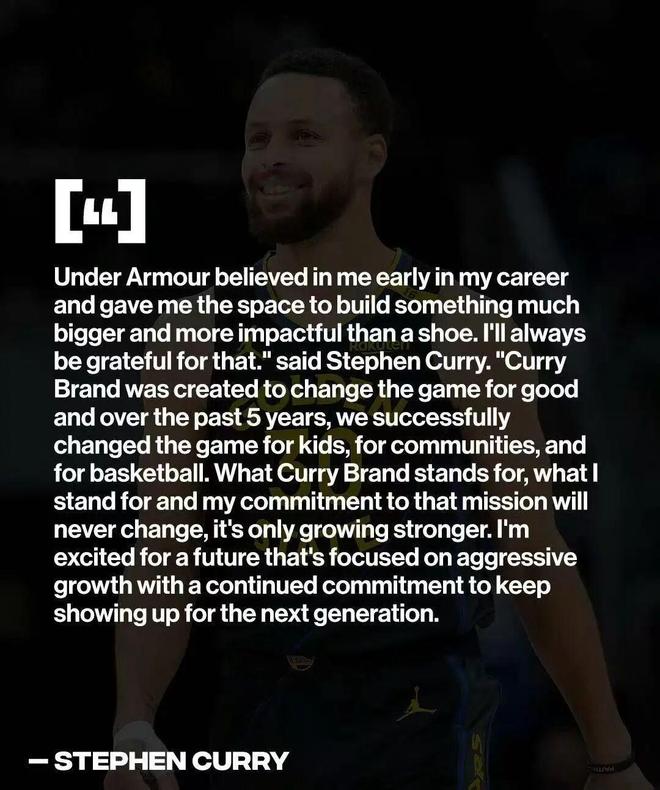 “安德玛在我职业生涯早期便给予信任,并为我提供空间,让我得以打造比球鞋更有意义、更具影响力的事业。对此我永远心怀感激。库里品牌所代表的信念、我个人的坚持,以及我对这份使命的承诺——永远不会改变。”